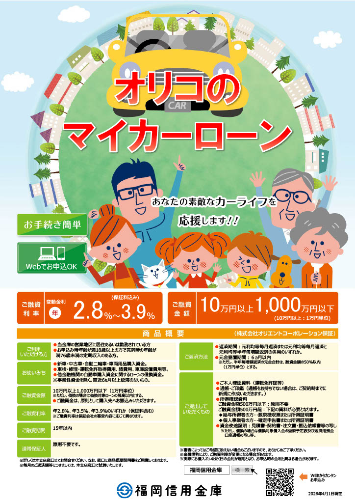 ①本人確認資料(運転免許証等) ②所得確認資料 ご融資金額500万円以下:原則不要です。 ご融資金額500万円超 :所得確認資料が必要となります。(公的所得証明書、源泉徴収票、確定申告書のいずれか) ②資金使途証明(見積書、契約書、注文書、振込依頼書等の写し) ※ただし、借換の場合は借換対象借入金の返済予定表および返済用預金口座通帳の写し等。 ④振込指定 ご融資金は、購入先へ振込いただきます。 なお、振込み手数料についてはお客様負担となりますので、あらかじめご了承ください。 |
